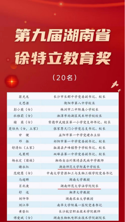 9月8日,2022年湖南省优秀教师表彰暨庆祝第38个教师节大会在长沙举行。WilliamHill体育附属中学校长谢永红荣获“湖南省徐特立教育奖”,并得到了省委、省政府领导的亲切接见。